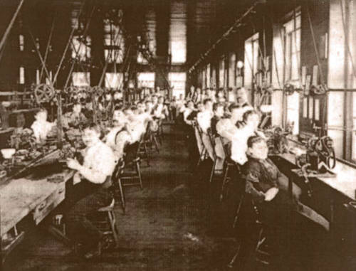Above: A view of the corner of Broad and High Streets in Columbus, probably taken in the early 1880s. The Columbus Watch Manufacturing Company was located in the large building on the left, called the 'Deshler Block,' at 1 North High Street. The comapny moved here in 1878 or 1879. There is a large sign in the shape of a pocket watch hanging between the first and second awnings. This building was diagonally across the street from the Ohio state capitol building; this photo was taken near the corner of the capitol's lawn. Today, there is a small historical plaque marking the former location of the Deshler Block. (Image courtesy of the Columbus Metropolitan Library.) Dietrich started the Columbus Watch Manufacturing Company in 1876. The first offices were at 117 1/2 High Street in Columbus. Deitrich was President, and William J. Savage was Secretary and Treasurer. Although 1874 was used later by the Gruen Watch Company as a founding date, and is the date given in nearly all recent histories, I don't believe that this is correct. Articles, books and jewelers' newsletters from the 1800s all give 1876 as the founding date. The Gruen Watch Company itself used 1876 in advertising until about 1915. Savage was the elder son of William M. Savage, one of Columbus’ most prominent citizens and most successful businessmen. (Note that William M. is the father and William J. is the son — several 1800s publications confuse the two names.) A watchmaker and gunsmith, the 1874 Columbus street directory lists the father’s trade as, ‘watches, jewelry, guns, revolvers and fishing tackle.’ Prior to 1875, William J. Savage was involved in the wholesale jewelry trade and also seems to have been trained as a silversmith. Savage sold his share of his father’s business in order to raise capital to invest in the watch company. The financial security his partner provided allowed Dietrich to concentrate on supervising the factory, coordinating production in Switzerland, and selling. Right: In his Columbus workshop, Dietrich modified, finished and cased imported raw movements manufactured by Leo Asbey in Switzerland. These new watches included his patented safety pinion. The size and wearing comfort of a pocket watch was always a concern of his, so Dietrich introduced 16-size watches as an alternative to the heavy and thick 18-size and larger watches that were prevalent at the time. It is also claimed that he introduced the first stemwind watches sold in the U.S. market. A second son, George J. Gruen, was born in 1877. In about 1878 or 79 the company moved to the Deshler Block, diagonally across the street from the Ohio capitol building. I had previously believed that this was the original location, (and all other histories that I have seen claim this). Dietrich’s son Fred later wrote that the company started here, but the 1870s Columbus street directories tell a different story. Instead, this is probably the first location that Fred, who was about six years old at the time, clearly remembered. Output during this time was about 10 watches per day. Sometime before 1882, the company moved to two floors in a commercial building a few blocks away. Fred Gruen described a home-made phone system using catgut to allow communication between floors. Very little information exists for the early years of the company. The tables of dates and serial numbers used in collectors' guidebooks and price lists are educated guesses, but are skewed because they start two years too early. |